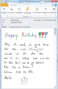 Ich gebe es direkt zu: Zum Glück kündigt Facebook/Outlook anstehende Geburtstage an, sonst würde ich wahrscheinlich sogar meinen eigenen vergessen. Wenn dann jemand Geburtstag hat, dann finde ich das es nichts unpersönlicheres gibt, als ein Posting auf der Pinnwand desjenigen. Ich für meinen Teil nehme dann entweder den Telefonhörer in die Hand oder schreibe eine Geburtstagskarte.
