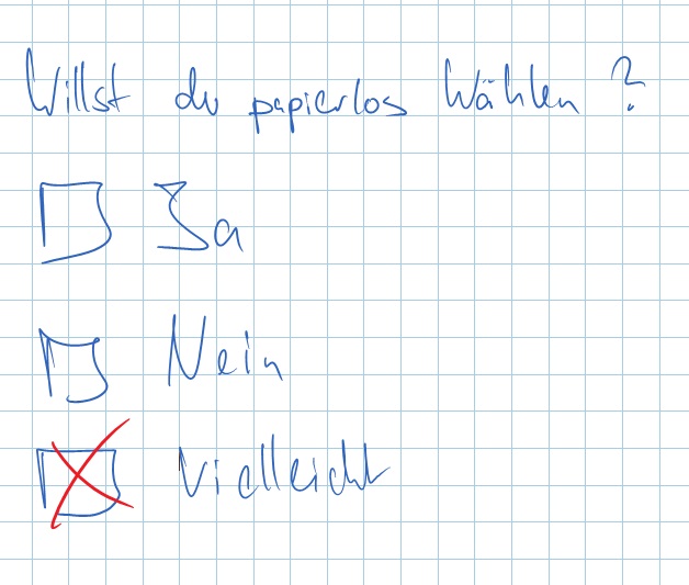 Mein erster Reflex, im Moment, sobald ich Papier sehe ist: ich überlege wie könnte man das ganze auch ohne Papier machen. Die Lösung, einen PC zu benutzen, liegt ja nahe -könnte man denken. Auch der Techniker in mir denkt sich: Wahlen sind natürlich ein heikles Thema, aber wenn man sich da mal nur ordentlich genug dran setzt, dann wird man schon eine sichere und gute Lösung finde.
