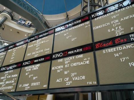 Das Plakat im Kino hat etwas mit allen Plakaten gemeinsam, es ist aus Papier. Aber das es auch anders geht konnte ich heute im Cinedom Kino in Köln feststellen. Nicht nur das eigentlich Kinoplakat, sondern auch die Anzeigetafel die sonst stumpf statisch war wurde ausgetauscht.