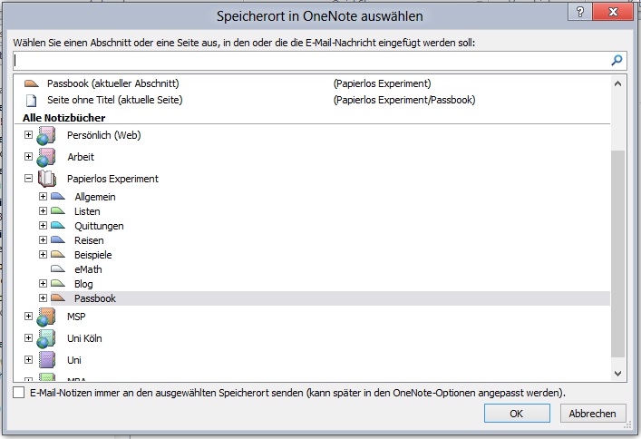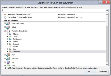 Danach fragt mich OneNote wo ich die Mail gerne hin verschoben hätte und ich wähle einfach mein „Passbook“ Abschnitt in meinem Notizbuch aus.