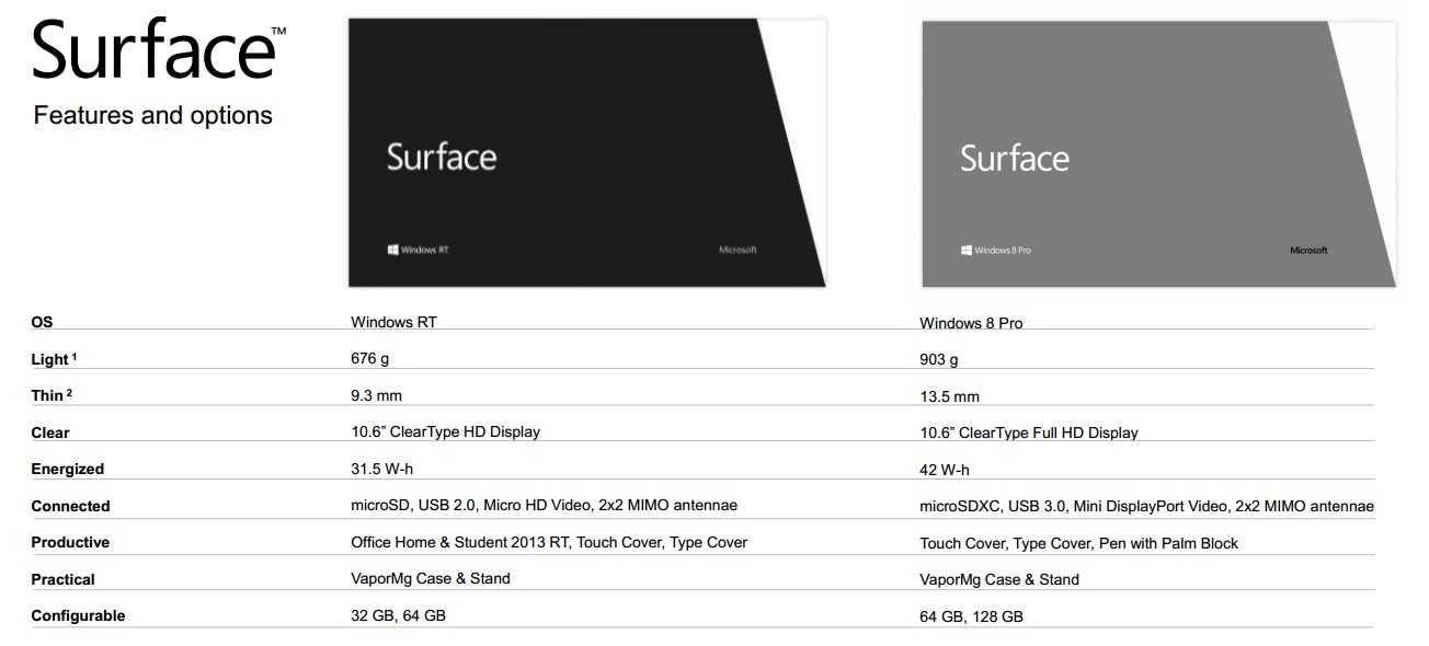 Es wurden zwei Geräte vorgestellt, beide heißen Surface, sind aber grundlegend unterschiedlich. Das eine Surface hat einen ARM-Prozessor von NVIDIA, man munkelt Tegra 3 SoC, was aber nicht bestätigt wurde, und läuft mit Windows 8 RT. Das Display beider Geräte hat 10,6“ aber auch wenn die Auflösung noch nicht bekannt ist wissen wir, dass das Windows8 RT Surface HD Auflösung hat. Der große Bruder wird einen Intel i5 Ivy Prozessor haben und Windows8 Pro als Betriebssystem. Das Display ist Full-HD fähig und zusammen mit dem größeren Akku ist es ein wenig dicker 13,5mm (zu 9,3mm). Der Surface hat jeweils einen integrierten Fuß, welcher für einen sicheren Stand sorgt.