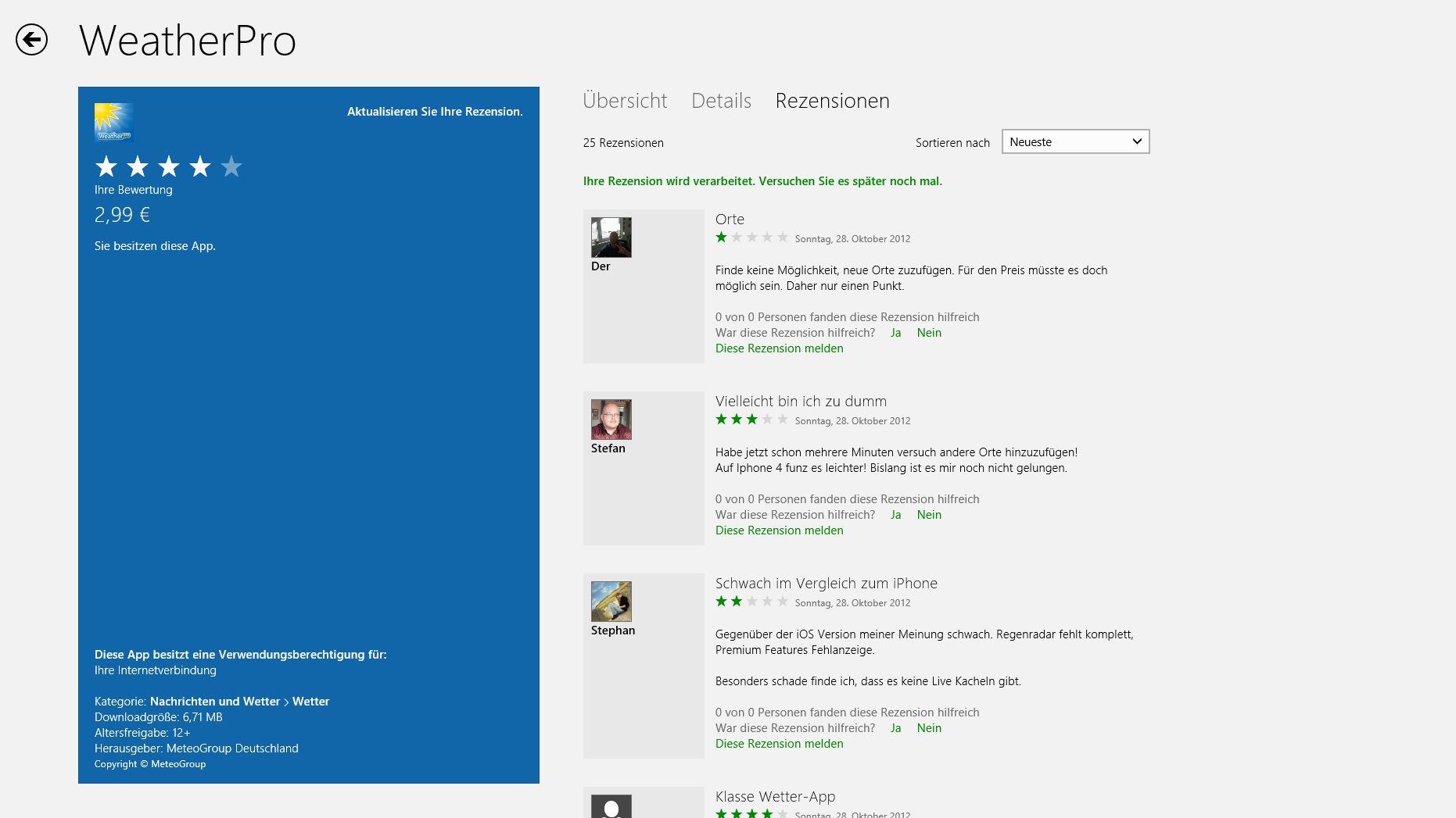 Wetter und Windows8 ist schon schwer wenn man nicht weiß wie man Windows 8 zu bedienen hat. Ich war gerade, wie im Moment eigentlich täglich, im Windows 8 Store unterwegs um zu sehen was es so für neue Apps gibt. Dabei bin ich auf die Weather Pro App für 2,99€ gestoßen. Ich benutze die App auch auf meinem Lumia 900 und bin sehr zufrieden mit ihr.