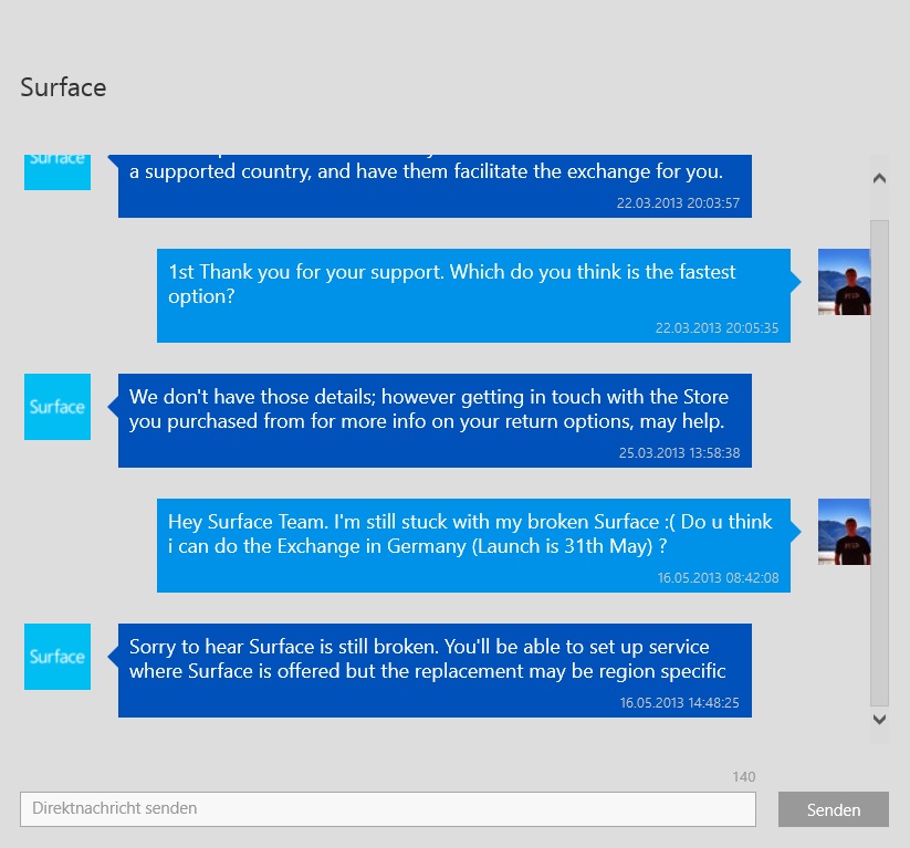 Natürlich ist ein defektes Gerät nicht cool, was aber unglaublich gut war/ist der Support von Surface. Ich habe auf Twitter „geweint“ das mein Surface Pro kaputt ist und das Twitter Team hat sich an mich gewandt und mir versucht zu helfen wo es nur geht. Als das Surface Pro in Deutschland dann erhältlich war hat der Austausch nur 3 Tage gedauert und der Prozess war super einfach und super transparent. Ich würde fast so weit gehen das das Surface Support Team fast genau so gut ist wie ein Umtausch bei Amazon!