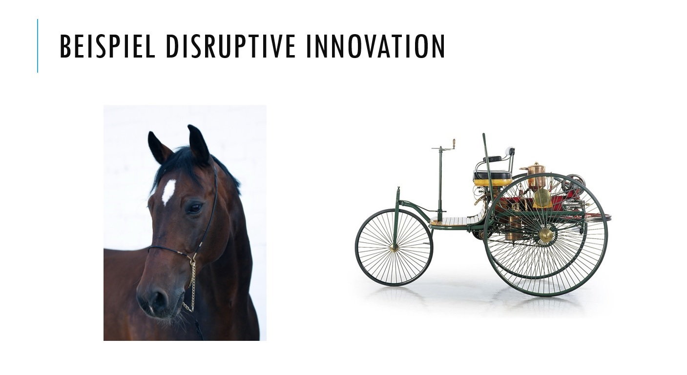 Das Pferd und das Auto. Wieder in Grob gesprochen: Eine disruptive Technologie/Innovation ist eine neue Technologie/Innovation die eine bestehende Technologie/Produkt vom Markt verdrängt. Sicher gibt es viele andere Technologien die wir kennen wie zum Beispiel Diskette->CD-Rom->USB-Stick, aber das Beispiel mit dem Auto gefällt mir aus einem Grund besonders gut. Betrachten wir mal die Ausgangslage: 1886 war eindeutig noch das vorherrschende Reisemittel das Pferd. Dann kam Gottlieb Daimler und „erfand“ den auf dem Bild zusehenden „Benz Patent-Motorwagen Nummer 1“. Das meine Schwester Vanessa heute mit dem Auto und nicht mit dem Pferd durch die Gegend reist (ich musste sie erwähnen, weil sie mir gerade ein Glas Wasser gebracht hat) liegt daran, dass das Auto das Pferd als „Technologie“ der Fortbewegung abgelöst hat aus diversen Gründe die heute eigentlich allen Klar sein sollten. 1886 sah das ganze noch nicht so aus und die Überlegenheit des ersten Automobils war noch lange nicht so erdrückend wie heute. Aus dieser Zeit gibt es ein sehr schönes Zitat: